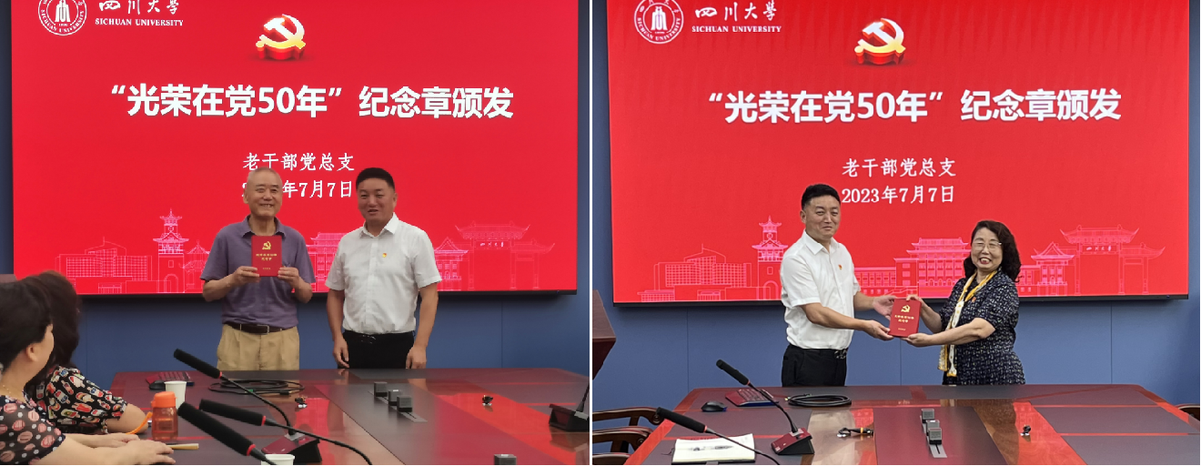 仪式上,老干部党总支书记、离退休工作处处长任泰山分别为刘建学、杨万贵两位党龄达到50周年的老党员颁发“光荣在党50年”纪念章。