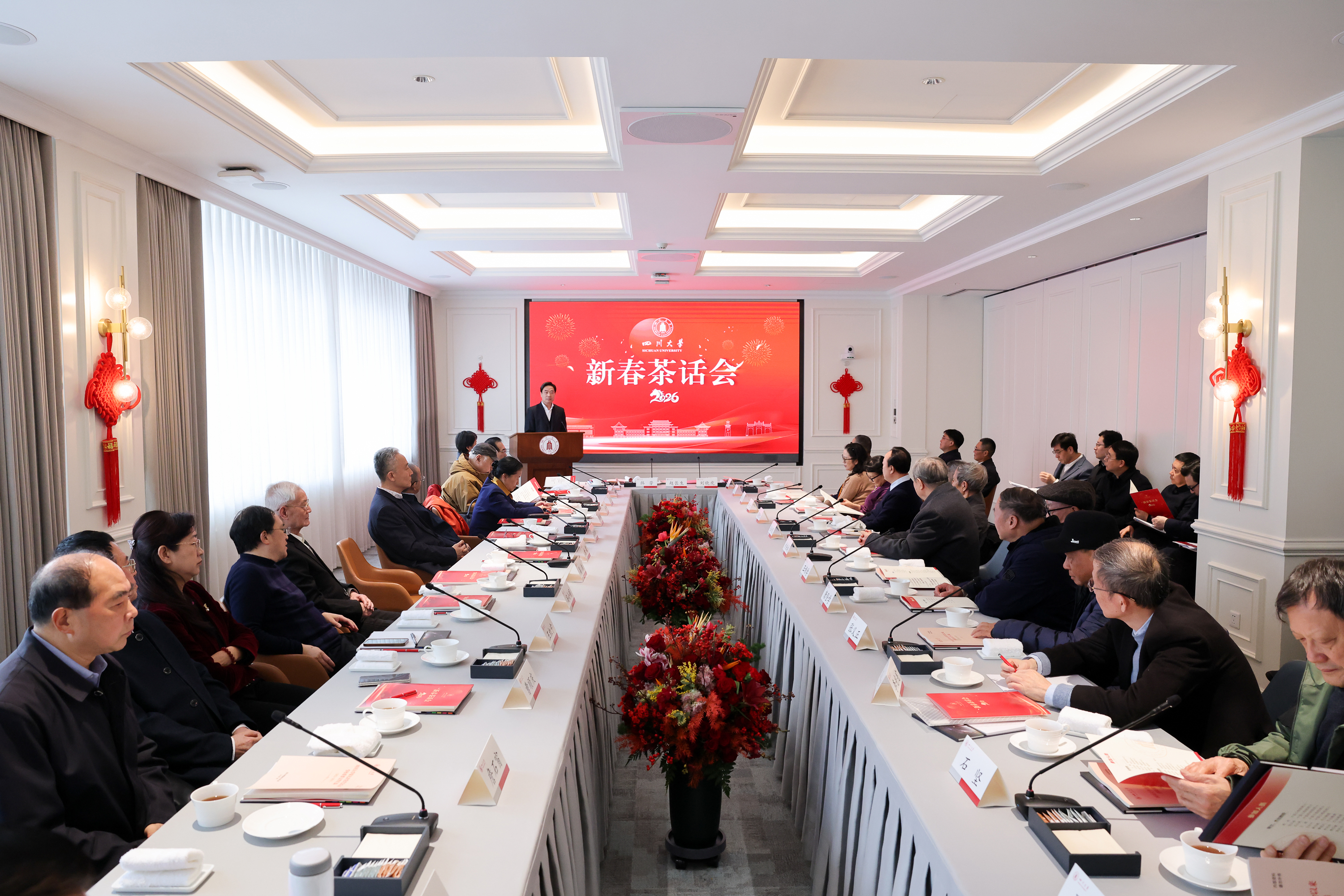 1月15日,学校召开2026年新春茶话会。校党委书记甘霖、校长汪劲松等全体在校校领导,学校老领导老同志,院士、杰出教授等高层次人才,以及相关部门负责人参加。
