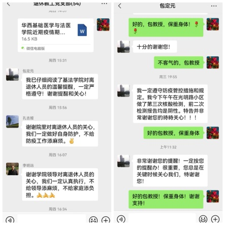 8月31下午,根据学校会议精神及时部署学院离退休老同志疫情防控工作预案。8月31晚,整理疫情相关信息,第一时间向离退休老同志发出警讯,向老同志传达成都市及学校相关防疫政策,提醒大家注意加强个人健康防护,关心老同志们的身体健康状况和生活状况,为全院离退休老同志筑牢第一道安全屏障。9月1日上午,细化《华西基础医学与法医学院近期疫情期间对离退休教师的温馨提醒》。对学院212名离退休老同志的居住、生活情况进行排查,特别重点关注“孤寡”、“独居”和“空巢”等特殊老同志的生活情况和健康状况,对特殊老同志进行电话联系,表达学校、学院的关心和慰问。
