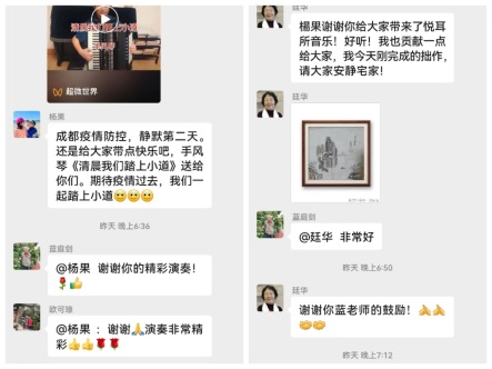 目前学院离退休老同志精神面貌和生活状态良好。大家积极响应政府、学校的号召,认真落实各项疫情防控措施,纷纷表示“要服从政府安排,管好自己,不给组织和家庭增添麻烦”。有老同志以绘画、音乐等方式相互鼓励。85岁张廷华老师将自己在疫情期间的绘画作品分享给大家欣赏,杨果老师专门录制了手风琴演奏音乐安慰大家。还有老同志心系疫情,发挥余热,彭晓东老师积极参加武侯区玉林街道跳伞塔社区的疫情防控工作。