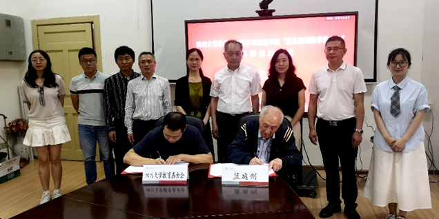 在师生的见证下,蓝庭剑教授与四川大学教育基金会副秘书长白鹏签署捐赠协议。张伟为蓝教授颁发捐赠证书。