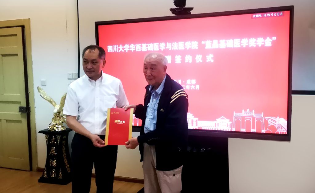 6月1日上午,华西基础医学与法医学院在华西第五教学楼二会议室举行隆重而简朴的“蓝晶基础医学奖学金”捐赠签约仪式。由学院87岁高龄的生理学教授蓝庭剑用积攒20余年的国务院特殊津贴捐赠10万元成立该项奖学金,用于资助家境贫困的优秀基础医学学子。蓝庭剑教授及其女儿蓝峰女士、学校党委副书记张伟、学校对外联络办公室副主任、教育基金会副秘书长白鹏、学校离退休处副处长唐洪、学院党委书记李华、院长李昌龙、党委副书记陈维操、工会主席黄莉、生理教研室主任杨文星及教师、学生代表参加了捐赠签约仪式。签约仪式由李华主持。