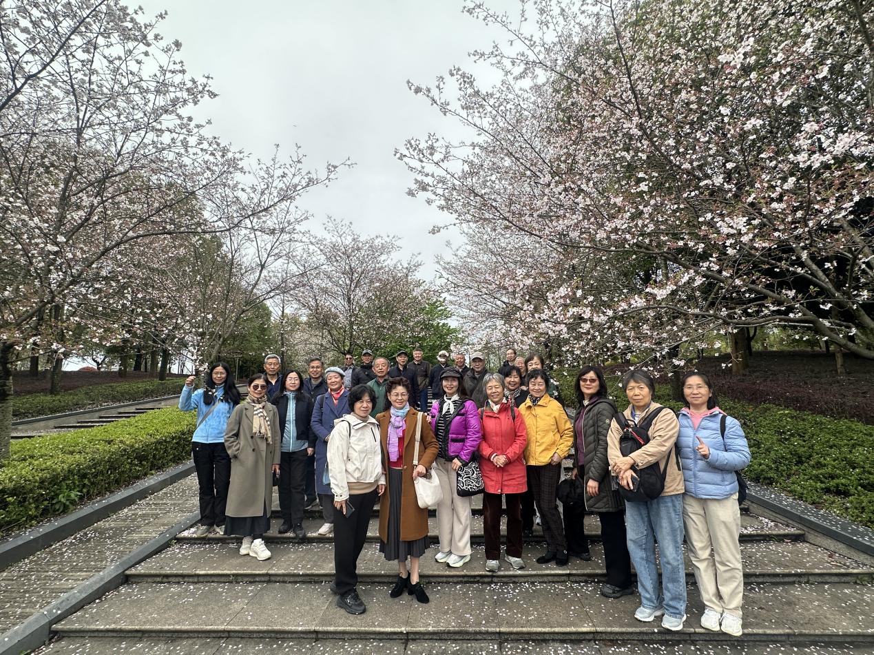 午后,一行人前往眉山樱花博览园。此时的博览园正值盛花期,老同志们漫步花海林间,沉浸式欣赏秀美春光。大家驻足观景、拍照打卡、合影留念,一路欢声笑语,尽情享受着春日里的惬意美好时光。